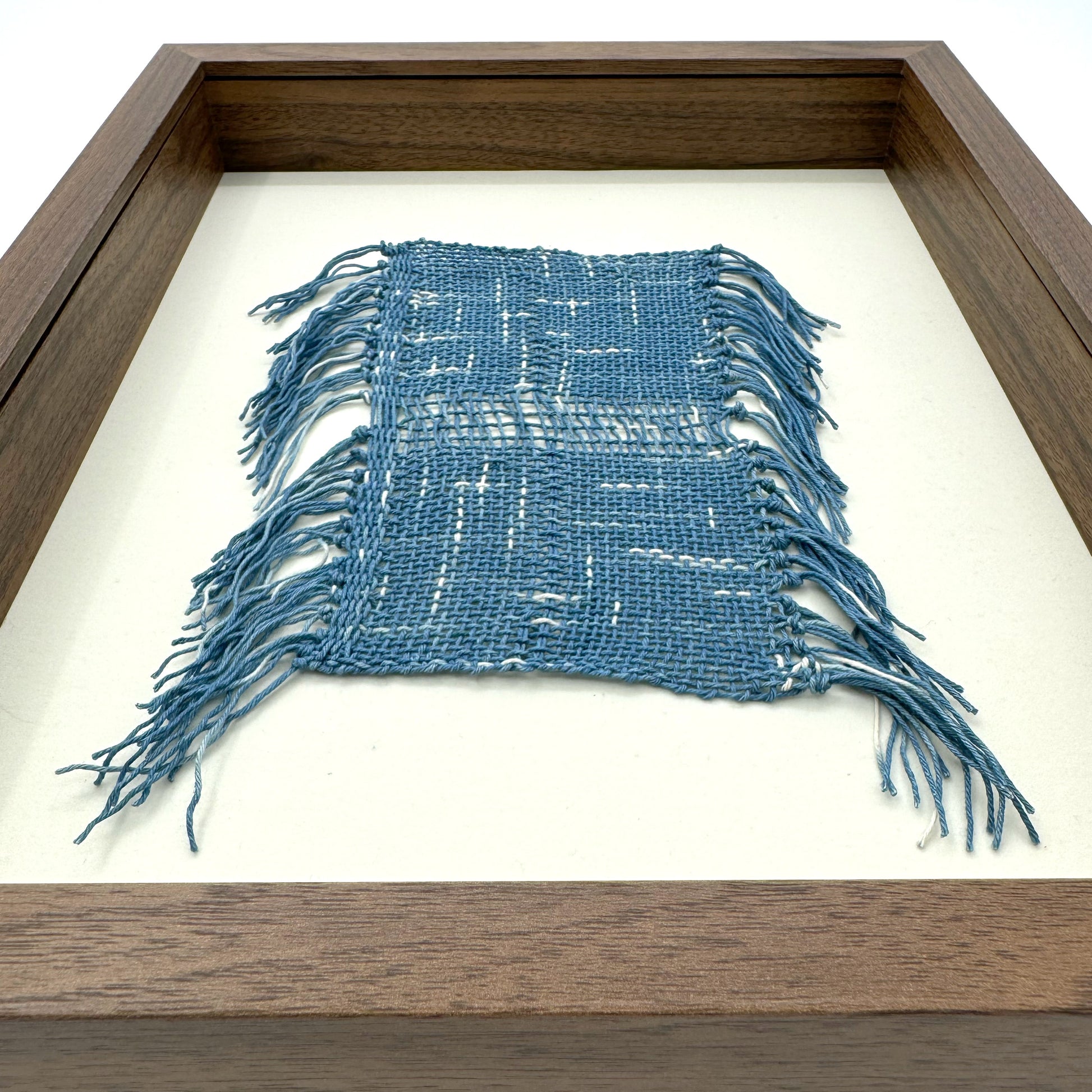 Hand dyed in natural indigo with resist ties. Handwoven on a rigid heddle loom.